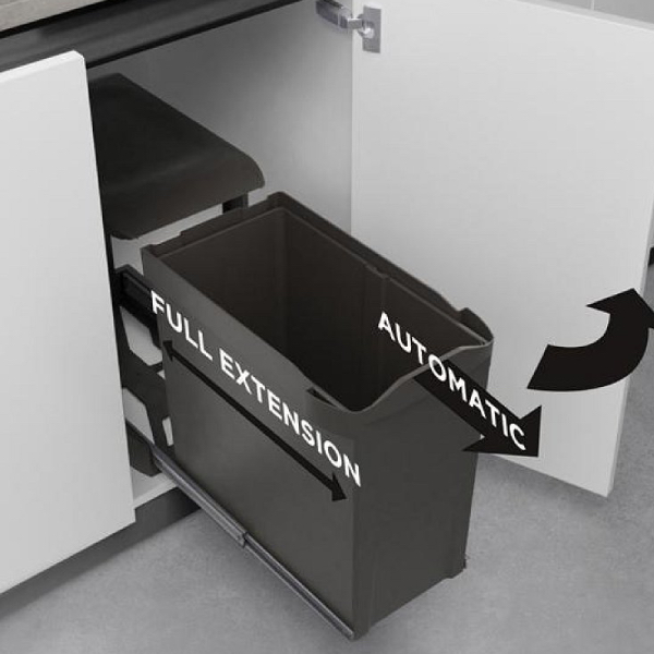 Automatický výsuv: Systém je prepojený s dvierkami – pri otvorení skrinky sa kôš sám vysunie a odklopí veko. Vaše ruky zostávajú čisté a odpad hádžete priamo dnu.