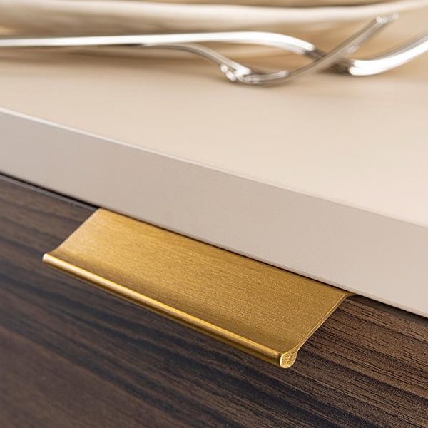 Unikátna geometria kolekcie sa elegantne prispôsobuje bočným stranám dvierok a dodáva nábytku sofistikovaný výraz.