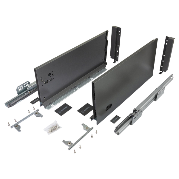 Výsuv V-BOX 18 Slim 3D je dodávaný ako kompletná sada, ktorá obsahuje bočnice, vodiace lišty, upevnenia čela a zadnej steny a krytky. Jeho jednoduchá montáž a elegantný vzhľad ho robia ideálnym riešením pre tých, ktorí hľadajú kombináciu kvality, dizajnu, ceny a funkčnosti.