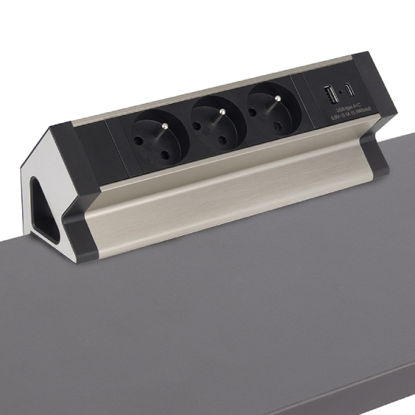 Desk Box – vstavaný stolový predlžovač s USB, francúzske zásuvky, oceľ drapaná