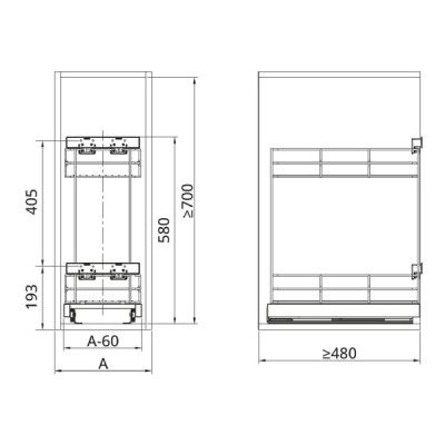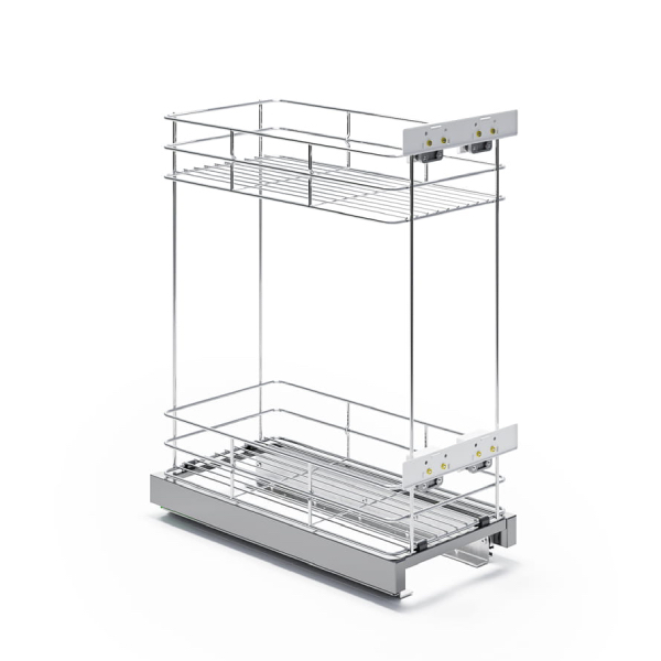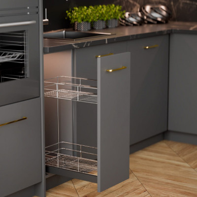 Vhodné pre úzke dolné skrinky na uloženie fliaš, kuchynských olejov, korenín a potravín. Plný výsuv zaručuje prehľadný prístup k obsahu a tichý doraz zabezpečuje komfort pri každodennom používa