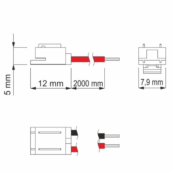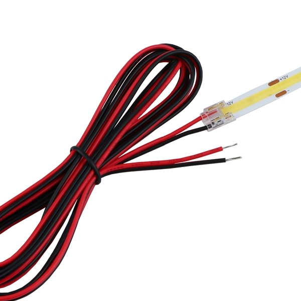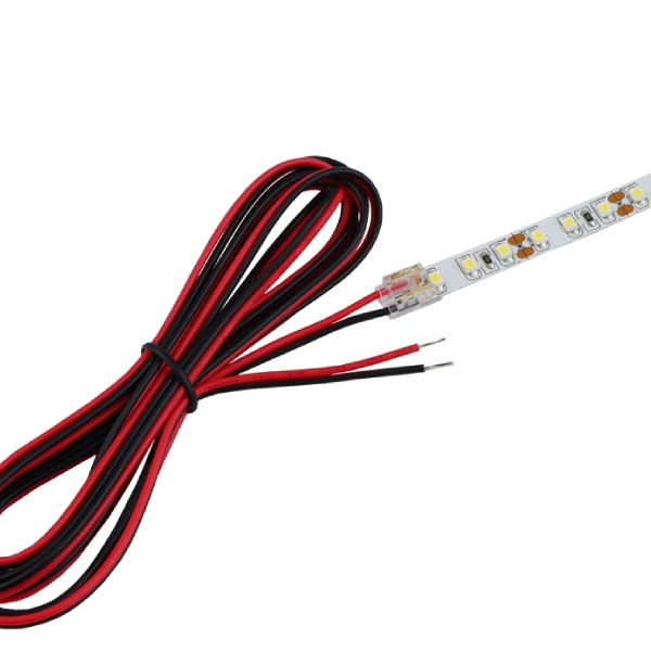 Praktický univerzálny konektor s 2-metrovým káblom pre napojenie LED pásov šírky 8 mm až 10 mm. Riešenie bez spájkovania, ktoré zjednodušuje montáž a zabezpečuje stabilné a čisté prepojenie medzi LED pásom a napájacím zdrojom alebo rozbočovačom.