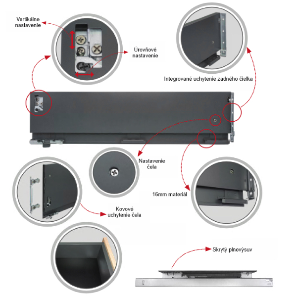 3D nastavenie v troch rovinách umožňuje jednoduché a presné nastavenie prednej časti. Vysoká kvalita plného vedenia v kombinácii s účinným mechanizmom soft-close zaručuje komfort používania so záťažou až 35 kg.
